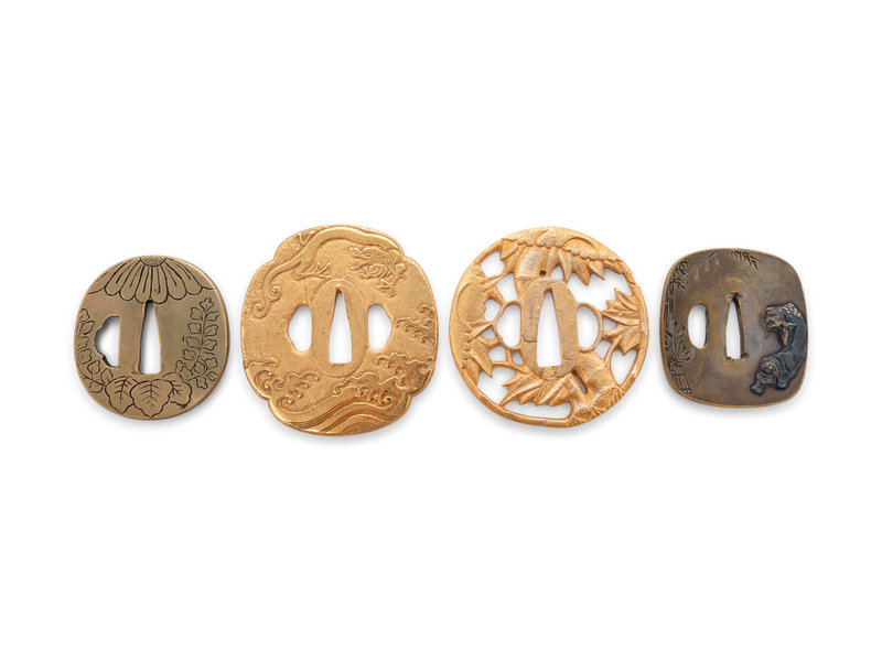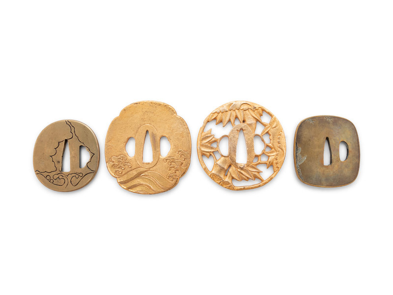 the first a smaller, round copper example, incised with a half a chrysanthemum flower and a leafy branch, the second a quatrefoil copper example, cast with a striding dragon above rushing waves; the third a round, reticulated brass example decorated with bamboo motif; the fourth an inlaid bronze example, showing a figure next to bamboo; unsigned.