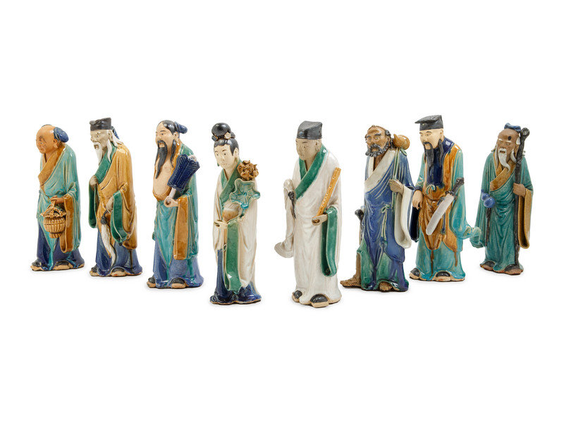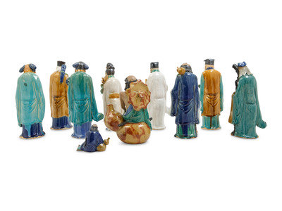 comprising eight immortal figures, a scholar figure and a drunk Li Bai figure, each applied with green, blue and yellow glaze to the robes.