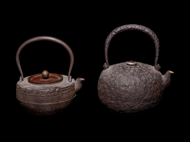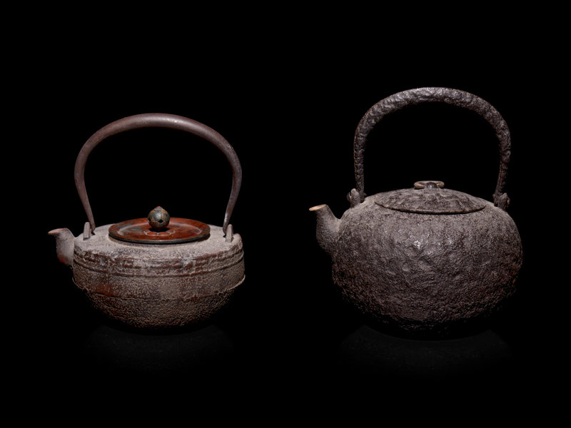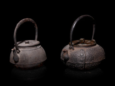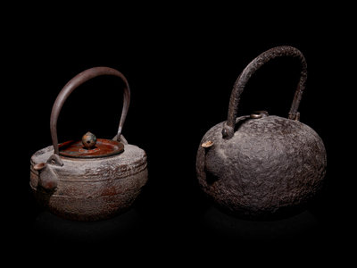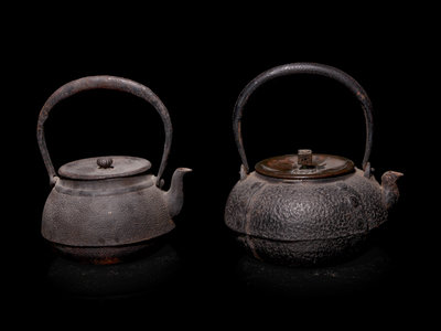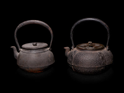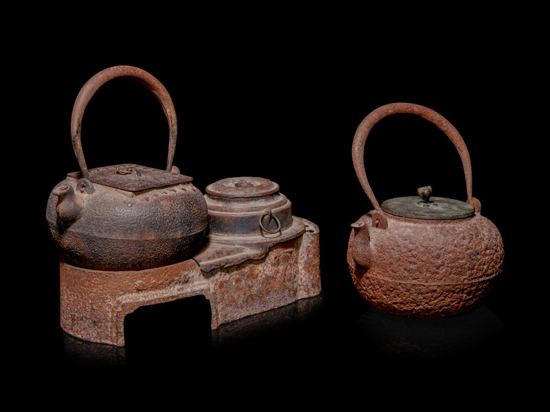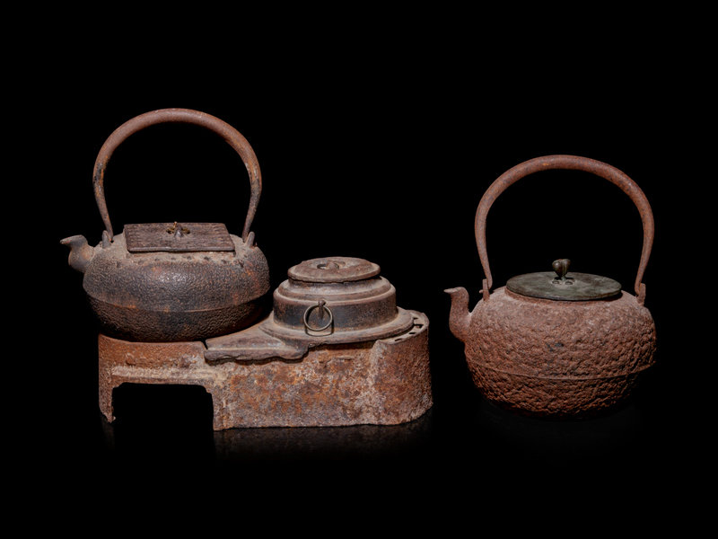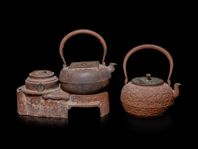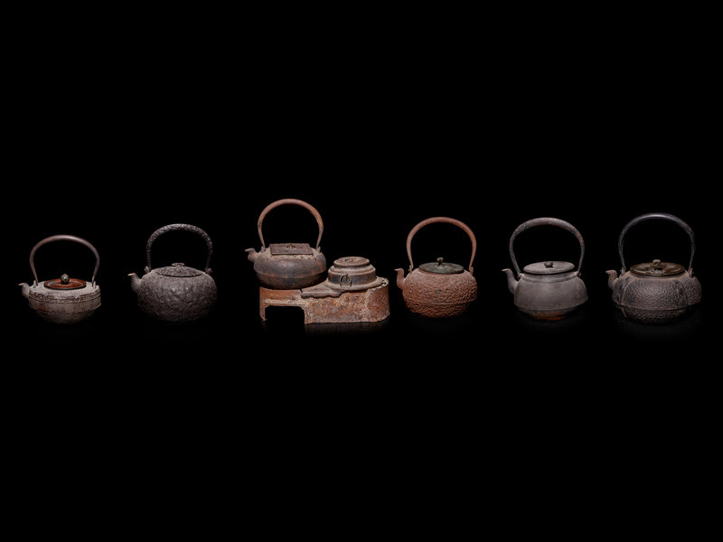 Seven Japanese Cast Iron Teapots, Tetsubin, and Burner