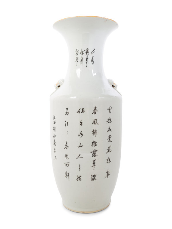 of baluster form surmounted by a trumpet neck and flared rim, painted to one side a scene of ladies gathering in the garden, the other side a Tang poem.