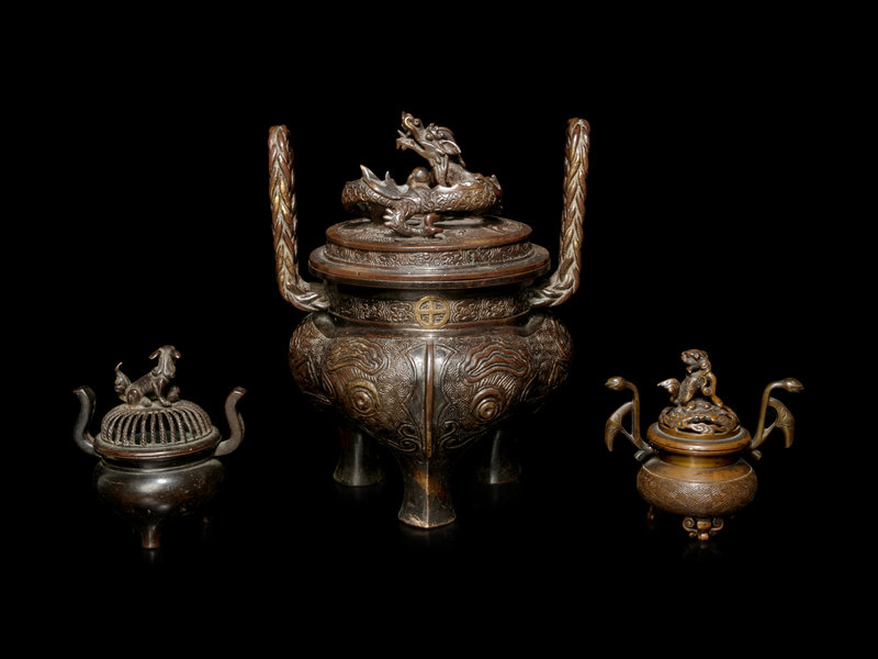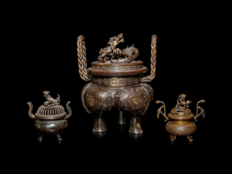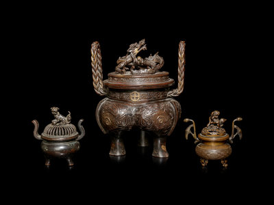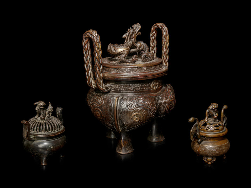Three Japanese Bronze Tripod Incense Burners and Covers