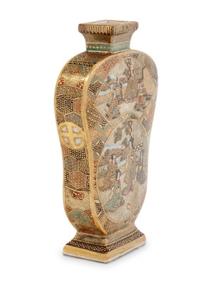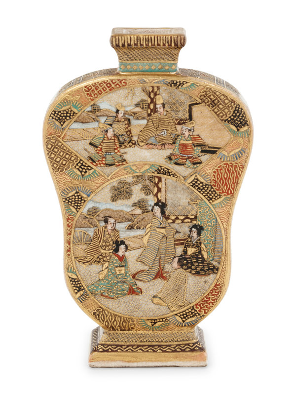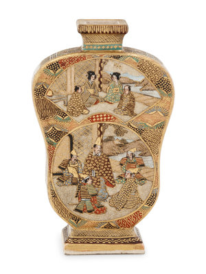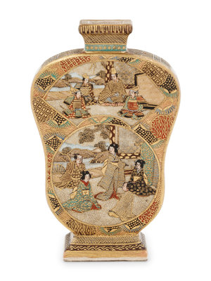 of flattened shield form, the exterior decorated with shaped reserves enclosing figures.