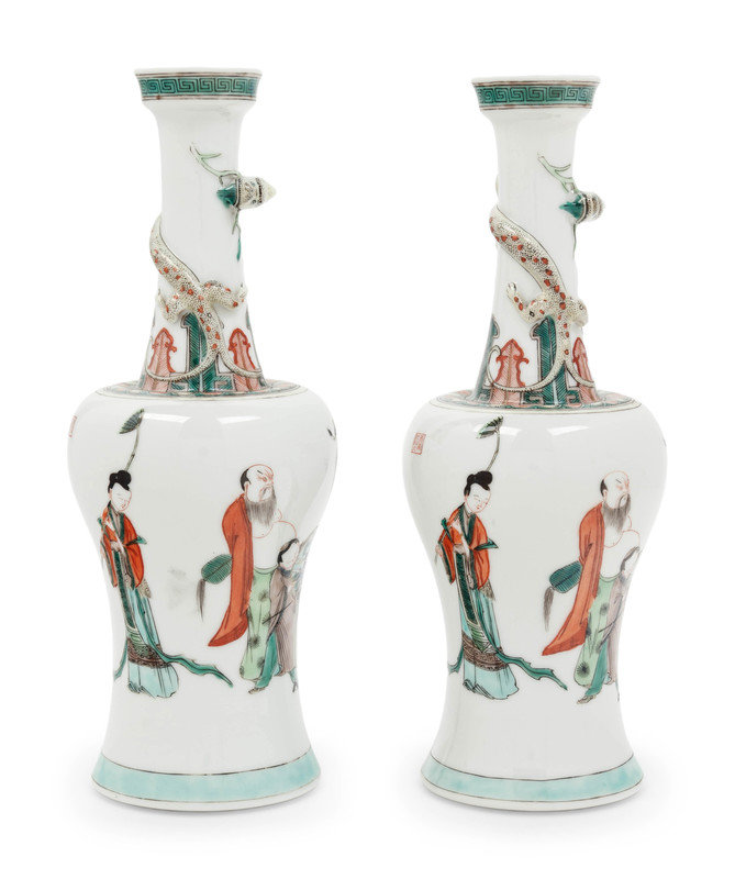 each baluster body rising from a spreading foot to a tall trumpet neck with a high-relief chilong, painted around the exterior with immortal figures,