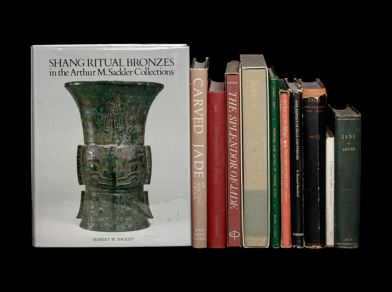 BAGLEY, Robert W. Shang Ritual Bronzes in the Arthur M. Sackler Collection, 1987.—SALMONY, Alfred. Carved Jade of Ancient China. 1982.—LOEHR, Max. Ancient Chinese Jades. 1975.—NOTT, Stanley Charles. Chinese Jade Throughout the Ages,1962; An Illustration Annotation on the Working and Dating of Chinese Jades,1941.—DOHRENWEND, Doris. Chinese Jades in the Royal Ontario Museum, 1971.—HANSFORD, S. Howard. Jade Essence of Hills and Streams The Von Oertzen Collection of Chinese and Indian Jades,1969.—CHIANG FU-TSUNG. Masterwoks of Chinese Jade in the National Palace Museum. Supplement, 1973.—SCHEDEL, J. J. The Splendor of Jade: Four Thousand Years of the Art of Chinese Jade Carving with an Introduction by Professor Na Chih-liang, 1974.—SEIICHI MIZUNO. Bronzes and Jades of Ancient China. 1959.—LAUFER, Berthold. Jade: A Study in Chinese Archaeology and Religion, 1912. Together 11 works.