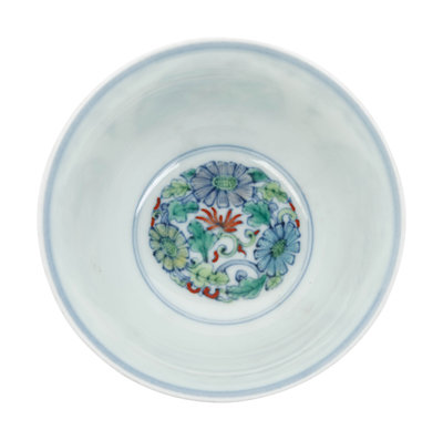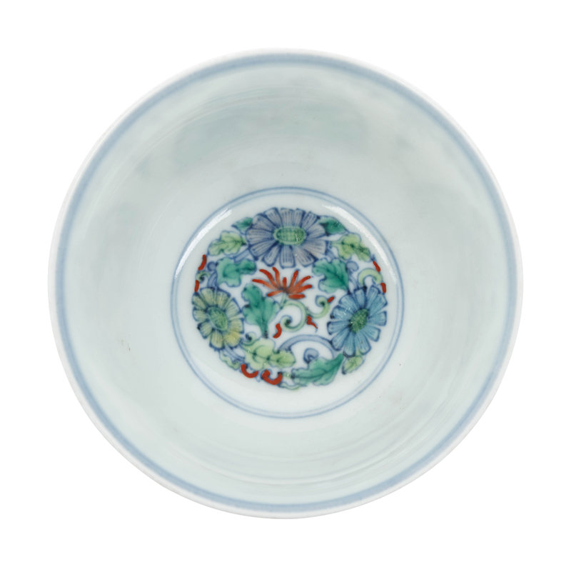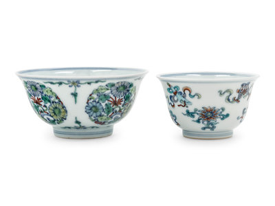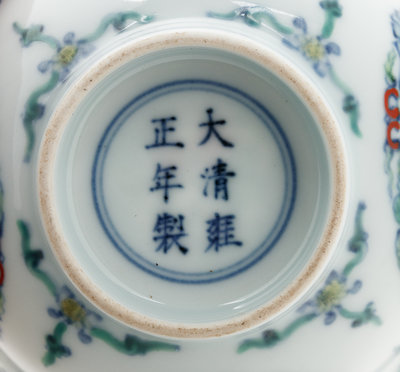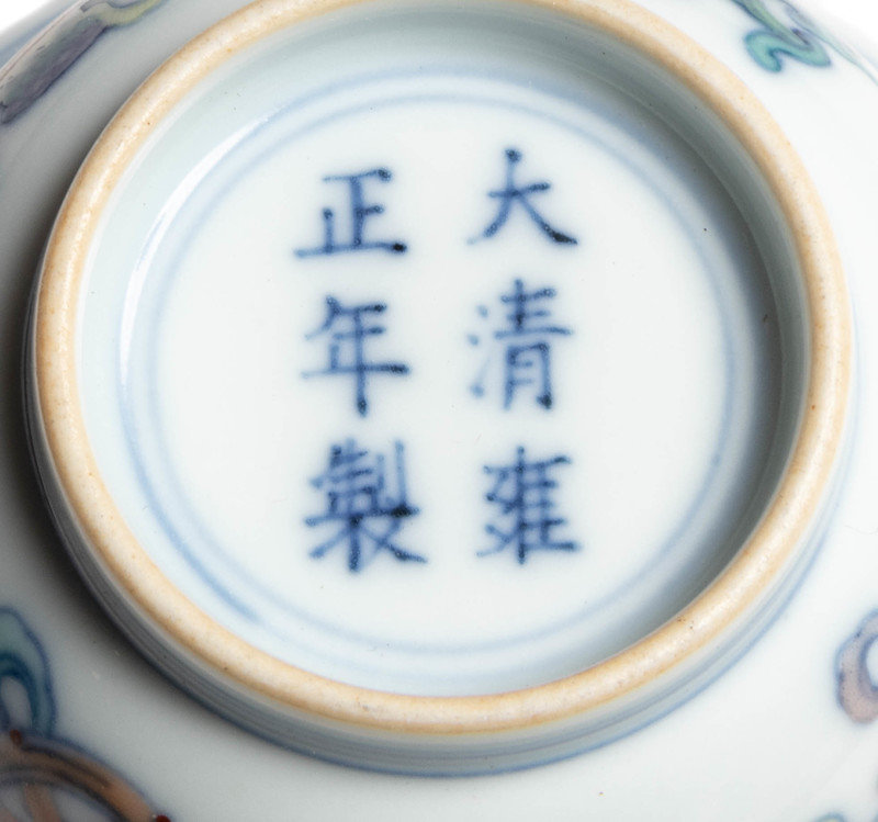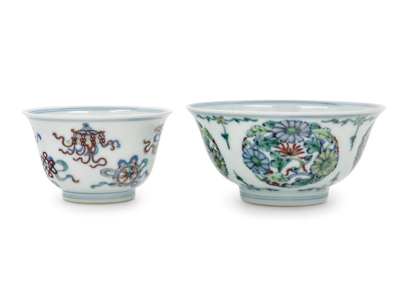 the first decorated with ribbon-tied Buddhist emblems, the second with floral medallions, each bearing a Yongzheng mark in underglaze blue to the underside.