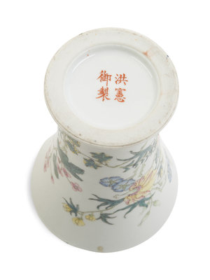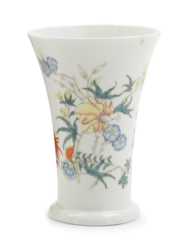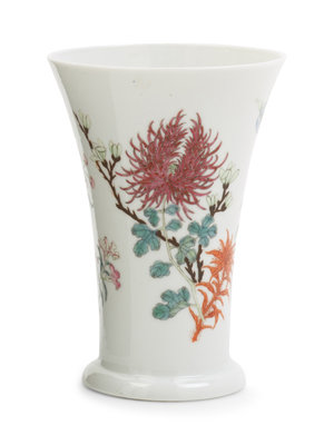 potted of beaker form, supported on a rimed foot, the steep and gently flaring sides rising to an everted rim, the exterior finely enameled with orchids, chrysanthemums and begonias.
