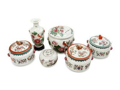comprising three bowls and covers, each decorated with bajixiang motifs, one bigger jar and cover, painted with flowers and birds, one small covered jar and a vase.