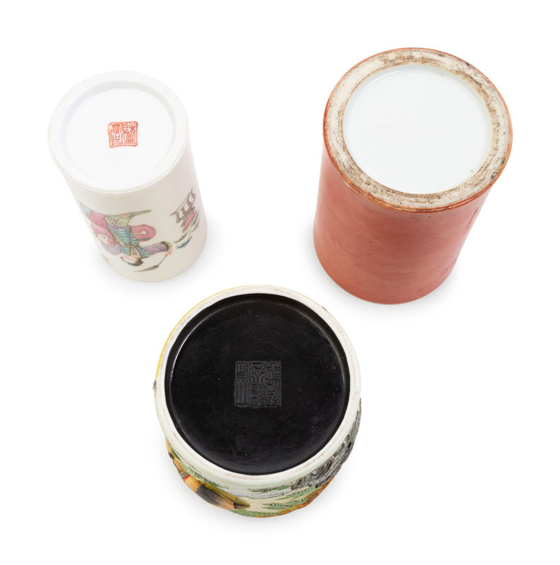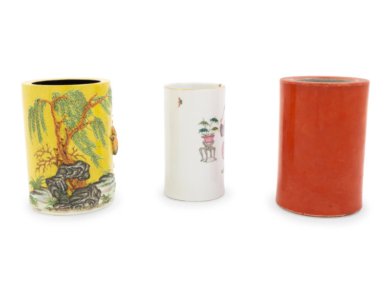 each of cylindrical form, the first a coral red glazed example, the second a yellow ground carved porcelain example decorated with cranes and willow trees above a river, the third a famille rose example with figural decoration.