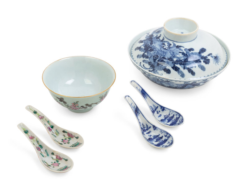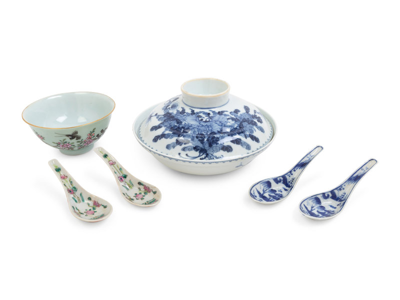 comprising a blue and white covered bowl, a celadon ground famille rose bowl, a pair of famille rose spoons and a pair of blue and white spoons.
