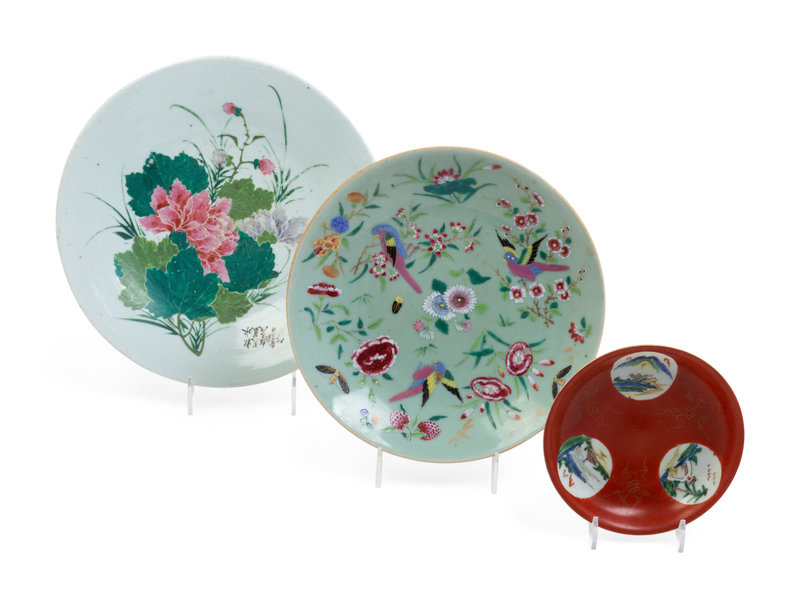 the first painted to the center with lotus blossoms, the second floral sprigs against a celadon ground, the third painted with roundels enclosing landscapes against a coral red ground.