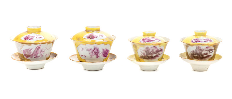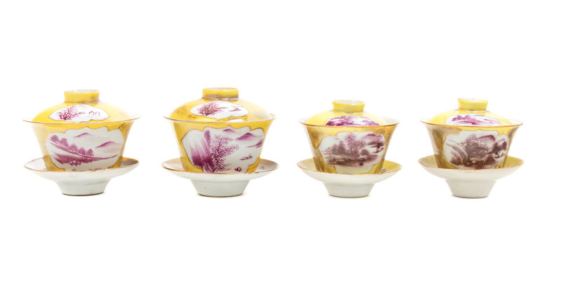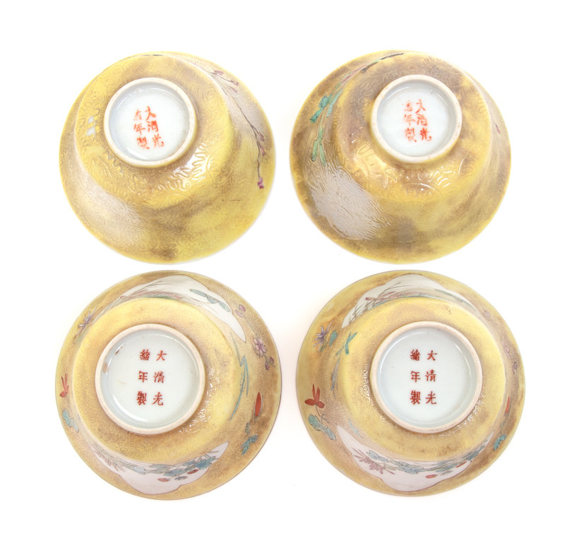 Two Pairs of Chinese Famille Rose Yellow Ground Teabowls