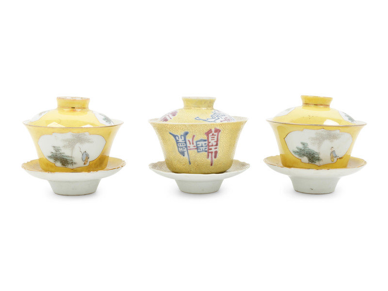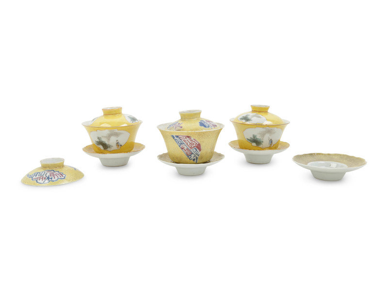 Two Pairs of Chinese Yellow Ground Famille Rose Porcelain Tea Cups