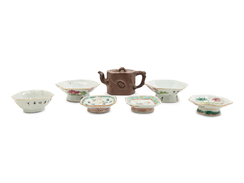 comprising a Zisha pottery teapot and cover, a green-ground teapot and cover, three hexagonal offering dishes, and three small dishes.