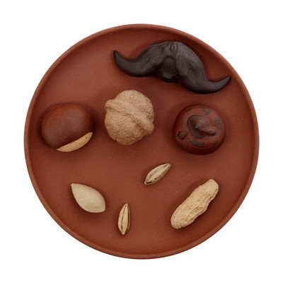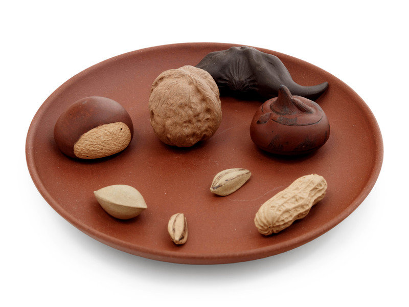 comprising seven various models of fruits and nuts naturalistically modeled after their biological counterparts, all above a pottery undertray.