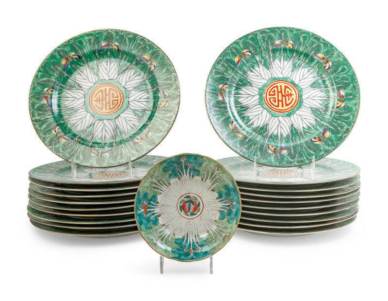 comprising twenty larger plates and one small serving dish, each decorated with overlapping cabbage leaves and butterflies, the center with a 'shou' character roundel.