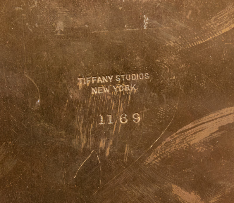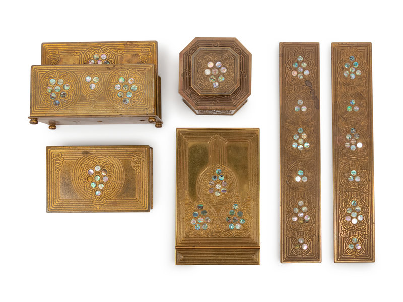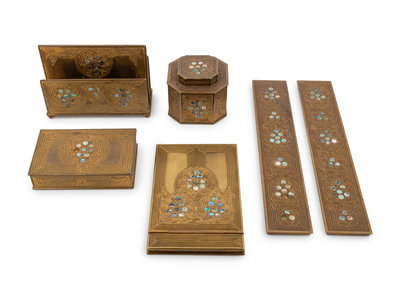 each impressed 'TIFFANY STUDIOS/NEW YORK', pad holder '1169, ink well '1157', pair of blotter ends '1153', covered box '1153', letter rack '1156'