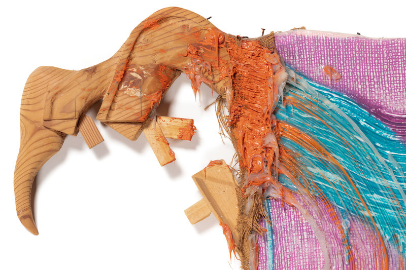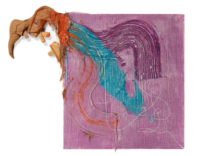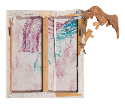 , 1992oil, silicone gel and wood on printed fabric