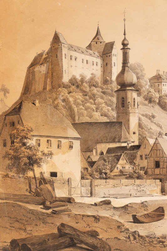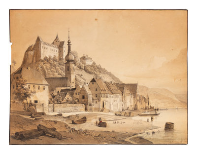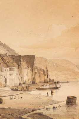 sepia ink, watercolor, and graphite on paper, heightened with white