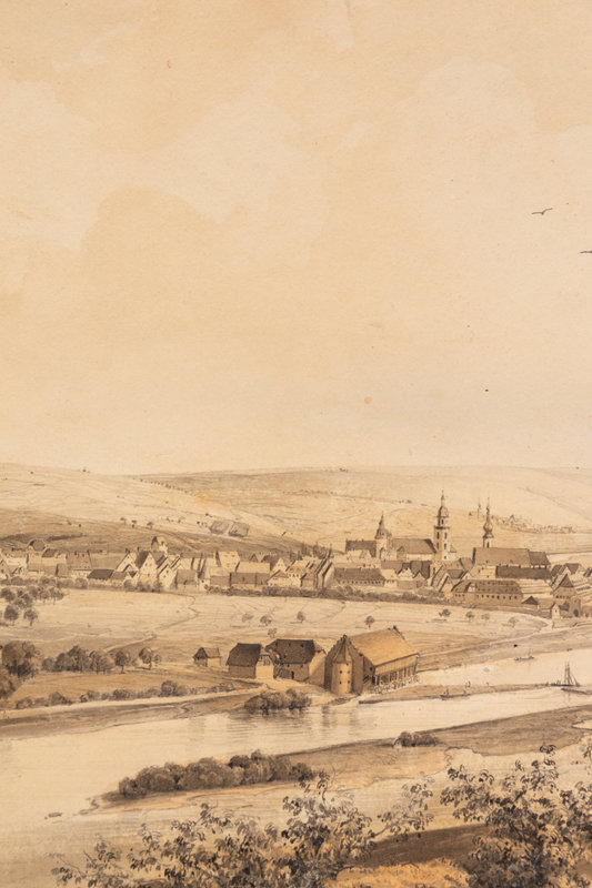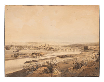 sepia ink, watercolor, and graphite on paper, heightened with white