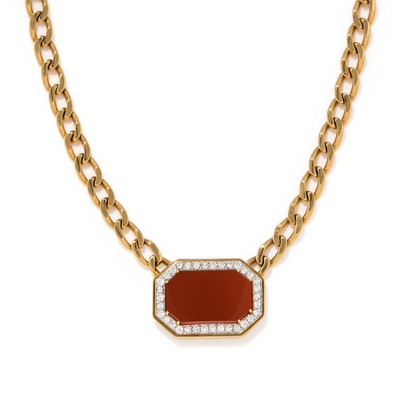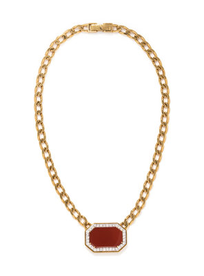Containing one octagonal carnelian plaque measuring approximately 15.00 x 23.90 mm and 35 round brilliant cut diamonds weighing approximately 1.25 carats total, suspended from a curb link chain. Mounted in yellow gold. 15 3/4 inches long.