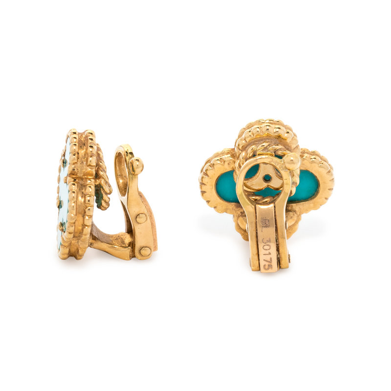 VAN CLEEF & ARPELS, YELLOW GOLD AND TURQUOISE 'ALHAMBRA' EARCLIPS