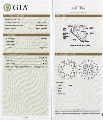 GIA, 2020, Report number 5211118302, 4.25 carats, I color, SI1 clarity, No fluorescence