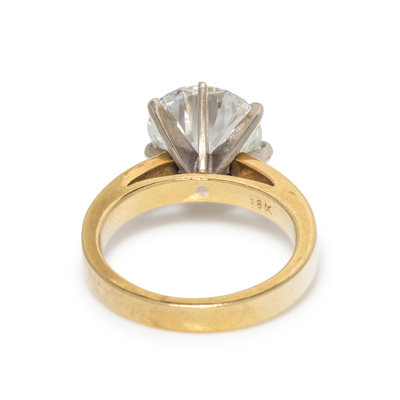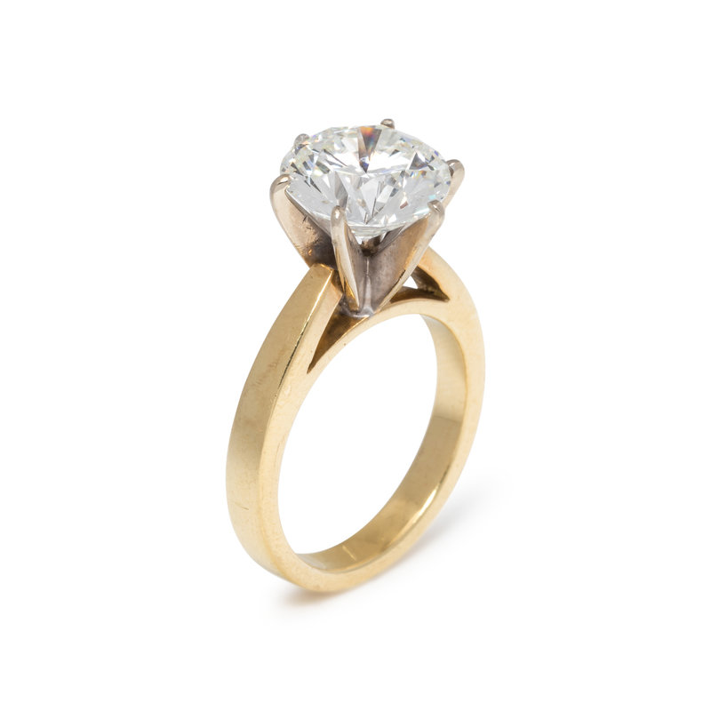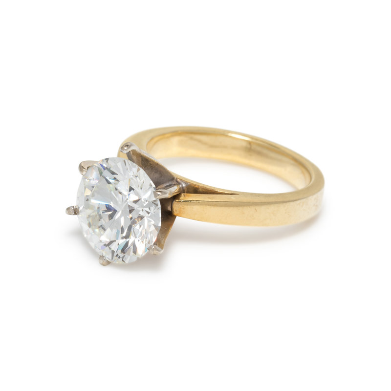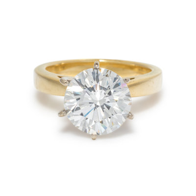 Containing one round brilliant cut diamond weighing 4.25 carats. Mounted in yellow gold. Ring size 6.