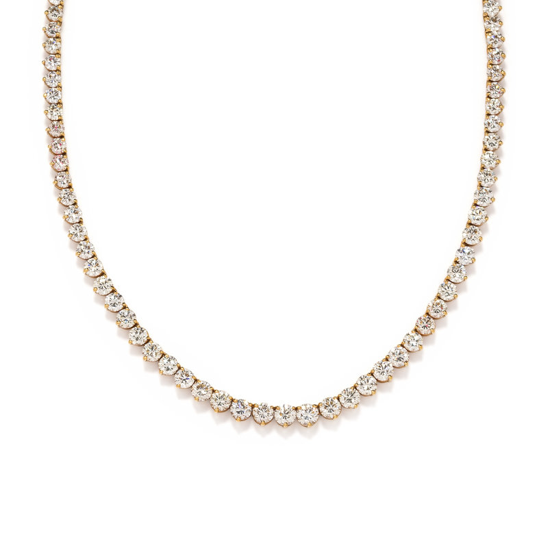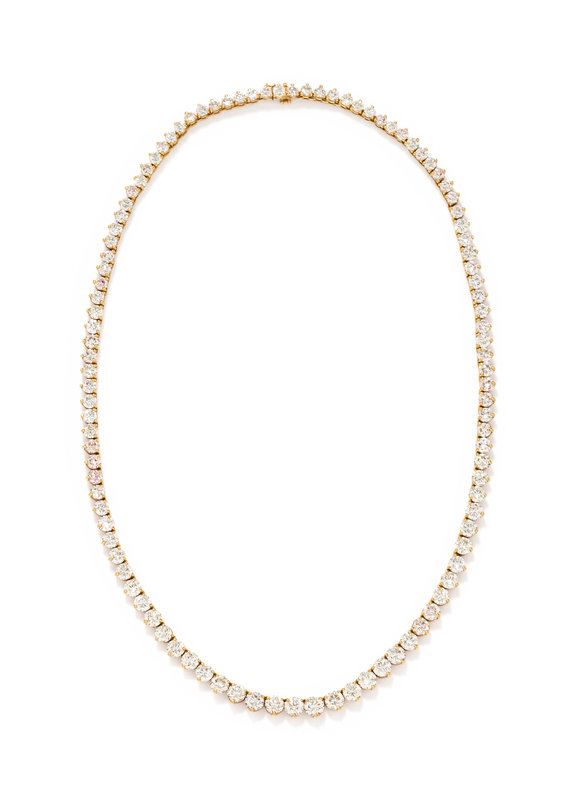 Containing 104 round brilliant cut diamonds weighing approximately 19.00 carats total. Mounted in yellow gold. 15 3/4 inches long.