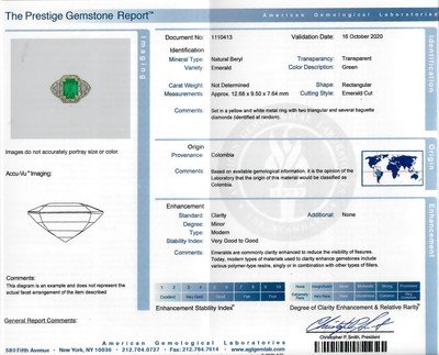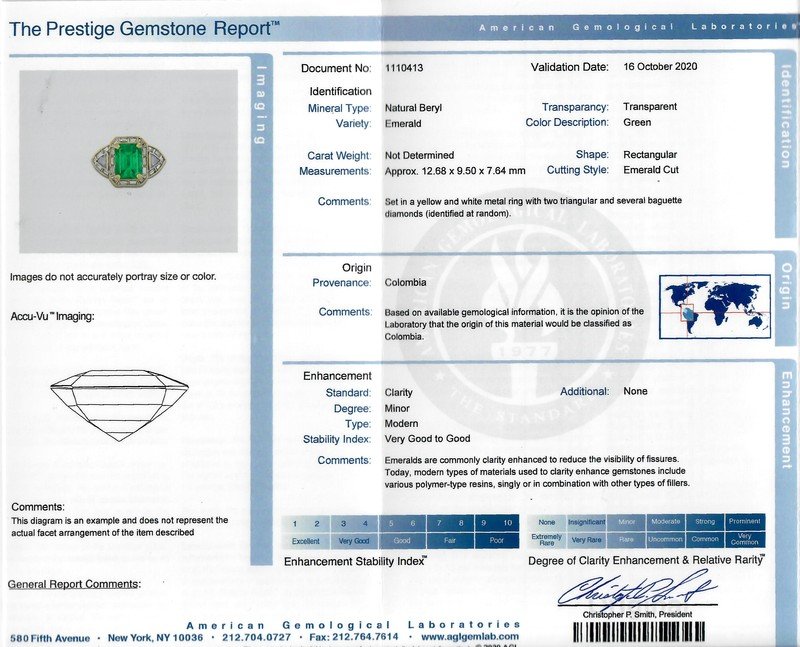 AGL, 2020, Report number 1110413, Natural Beryl, Emerald, Colombia, Minor-Modern treatment