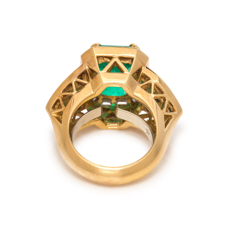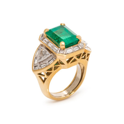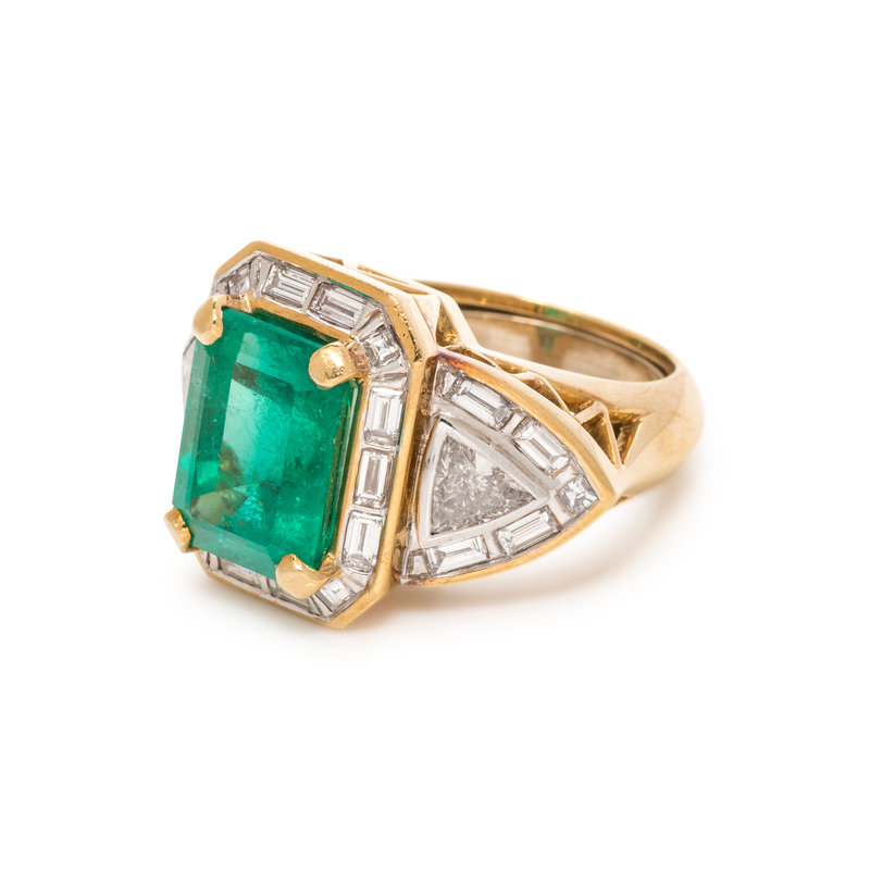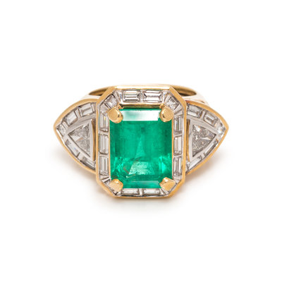 Containing one emerald cut emerald measuring approximately 12.68 x 9.50 x 7.64 mm, two triangular brilliant cut diamonds weighing approximately 0.80 carat total and 18 baguette cut diamonds weighing approximately 1.25 carats total. Mounted in yellow gold with white gold detail. Ring size 6 3/4.