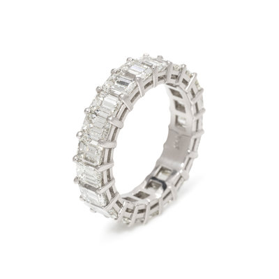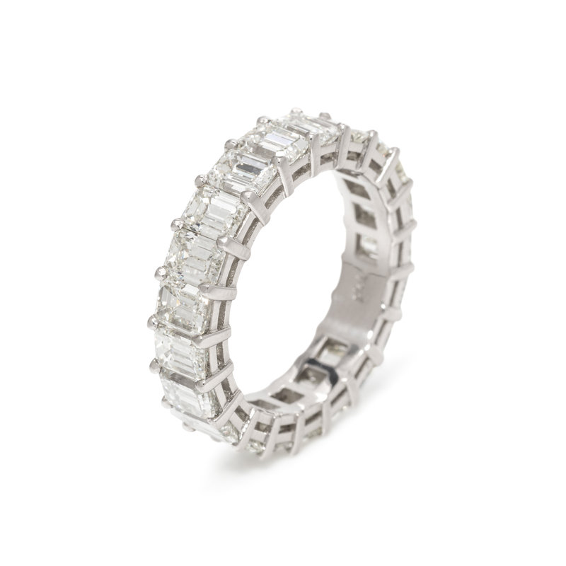 Containing 21 emerald cut diamonds weighing approximately 7.00 carats total. Mounted in platinum. Ring size 6 1/2.
