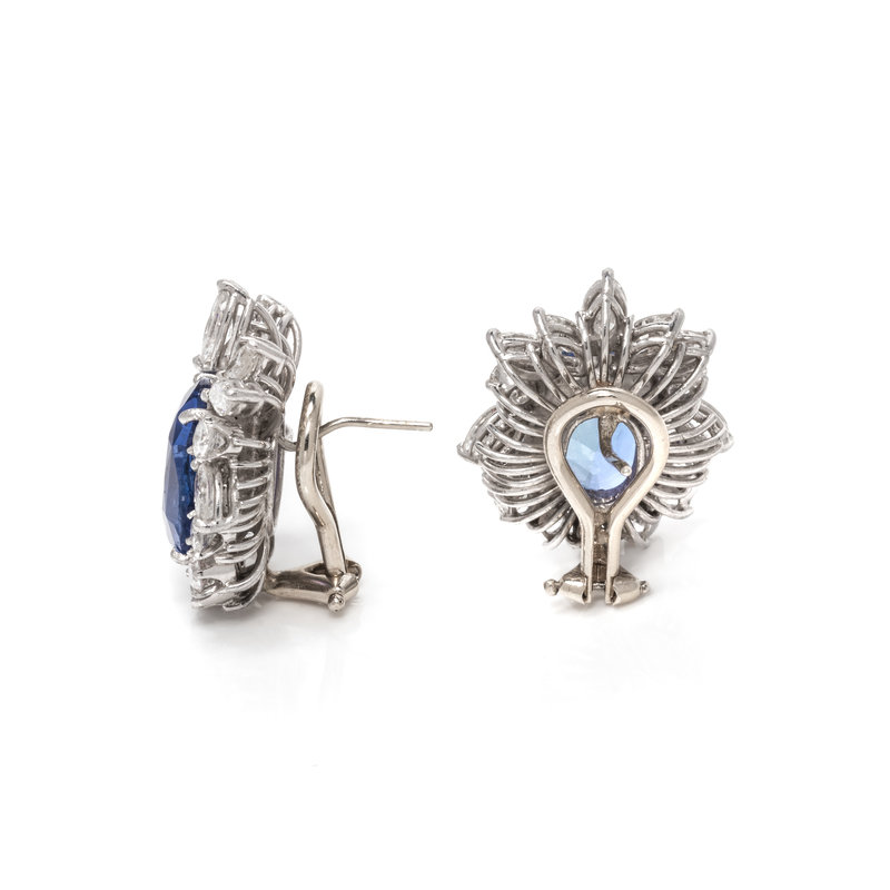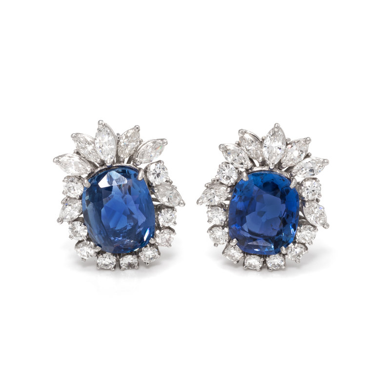 Containing two cushion modified mixed cut sapphires measuring approximately 11.40 x 9.23 x 5.52 mm and 11.60 x 9.34 x 5.40 mm, 14 marquise and 18 round brilliant cut diamonds weighing approximately 2.35 carats total. Mounted in platinum. 13/16 inch long.