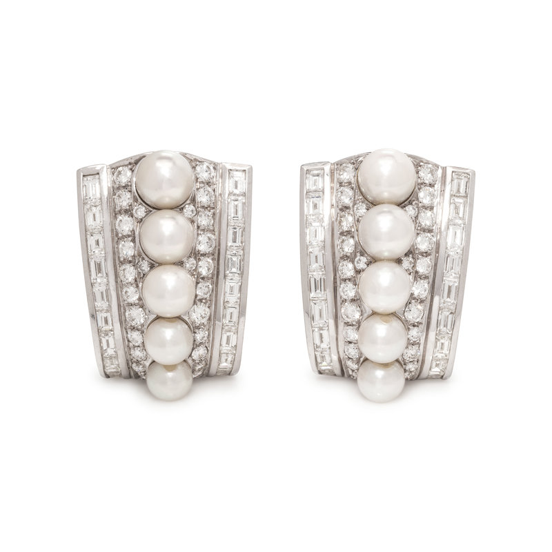 Containing 36 baguette and 62 round brilliant cut diamonds weighing approximately 5.00 carats total and 10 pearls measuring approximately 5.75-6.90 mm in diameter, posts with clip backs. Mounted in white gold. 1 1/8 inches long.