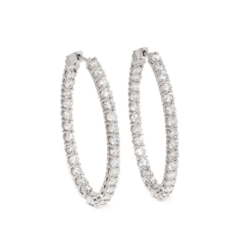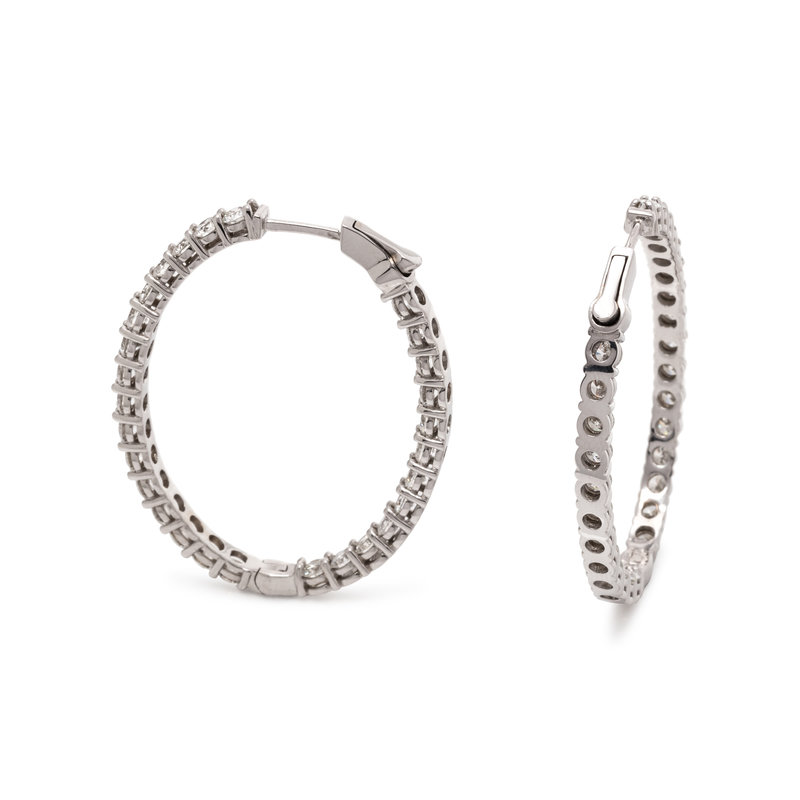 In an inside out style, containing 56 round brilliant cut diamonds weighing approximately 5.00 carats total. Mounted in white gold. 1 5/8 inches long.
