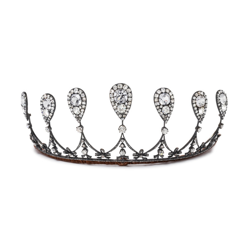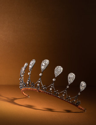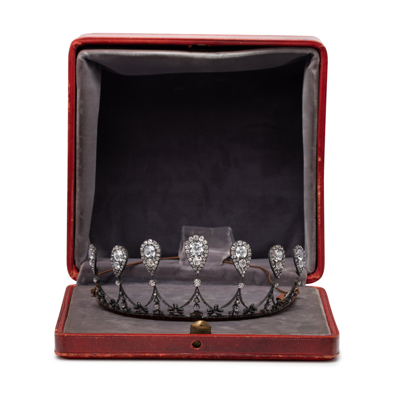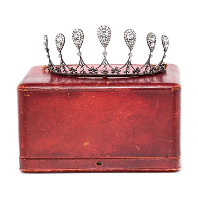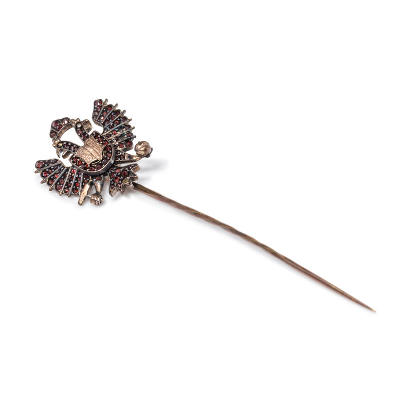 Containing numerous old mine, rose and mixed cut diamonds weighing approximately 18.00-20.00 carats total and seven diamond simulants. Mounted in silver-topped gold, together with a silver Austro-Hungarian coat of arms stickpin containing numerous round mixed cut garnets.