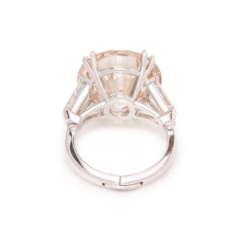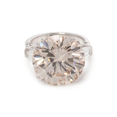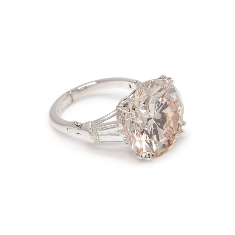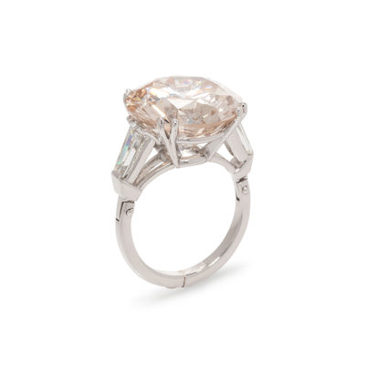 Containing one round brilliant cut diamond weighing 12.05 carats and two tapered baguette cut diamonds weighing approximately 1.20 carats total, with expandable shank. Mounted in platinum. Ring size 4 3/4.