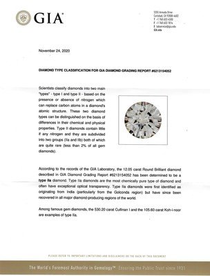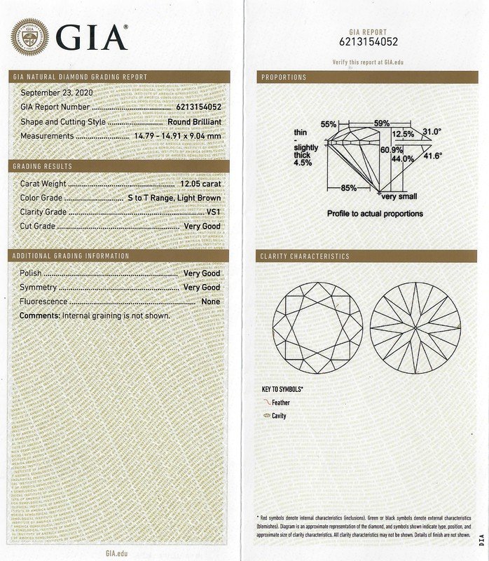 GIA, 2020, Report number 6213154052, 12.05 carats, S to T Range, Light Brown color, VS1 clarity, No fluorescence