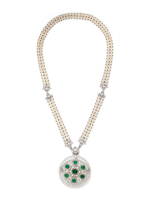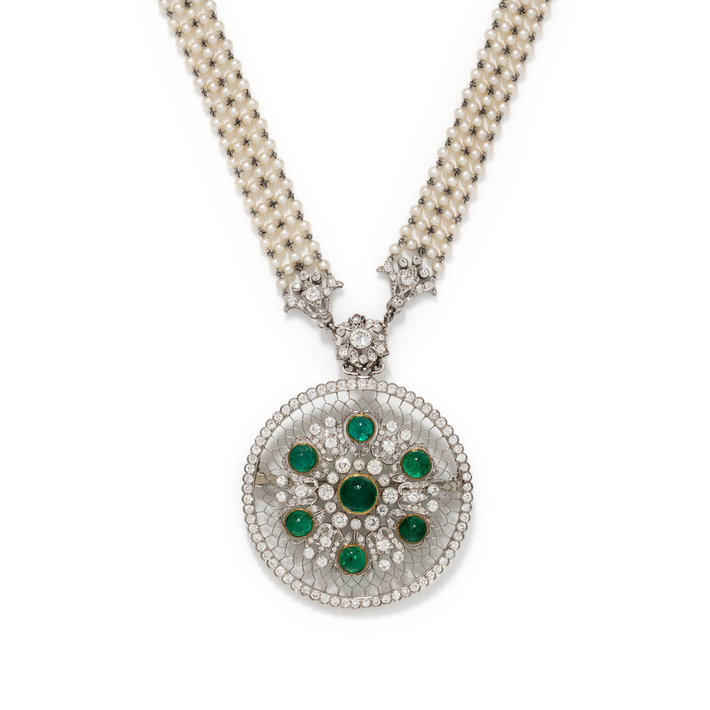 Consisting of a removable pendant/brooch containing six round cabochon emeralds measuring approximately 5.55-8.25 mm in diameter and numerous old European cut diamonds weighing approximately 4.55 carats total, suspended from a necklace containing one old European cut diamond weighing approximately 0.45 carat, numerous old European cut diamonds weighing approximately 2.80 carats total and numerous seed pearls. Mounted in platinum. 22 inches long.