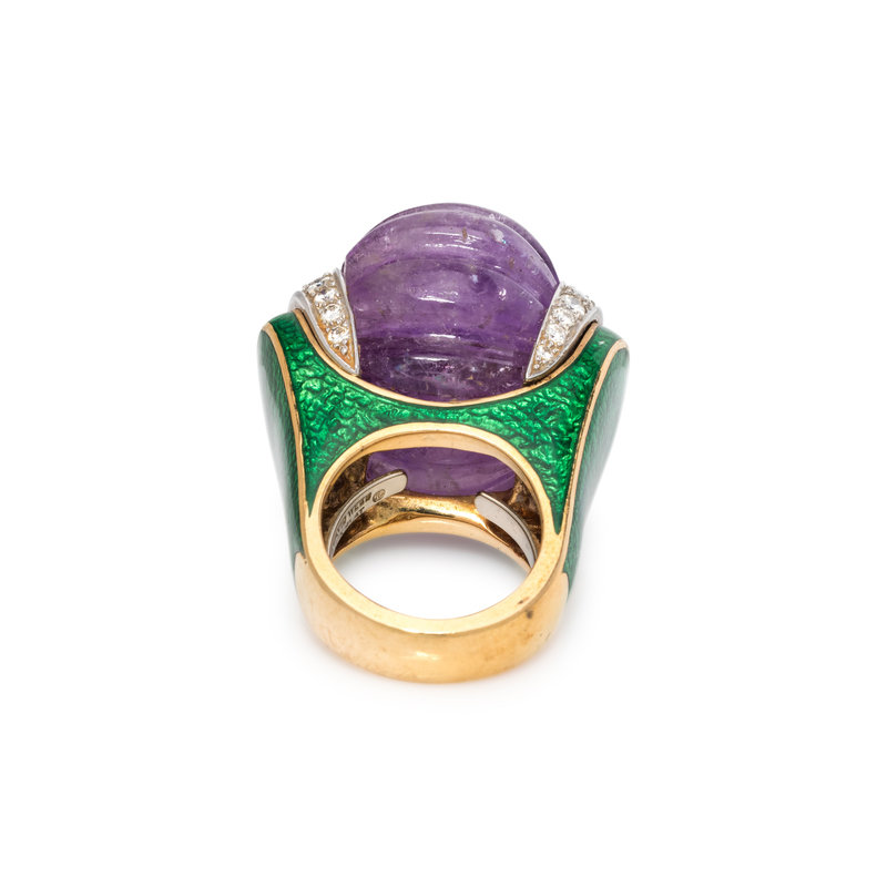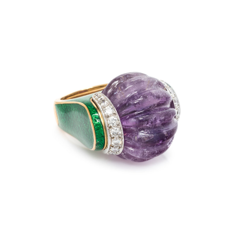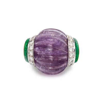 Containing one melon carved amethyst, 24 round brilliant cut diamonds weighing approximately 1.00 carat total and green enamel detail. Mounted in yellow gold and platinum. Ring size 5 3/4.