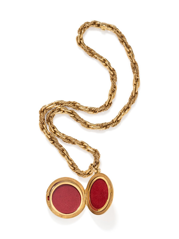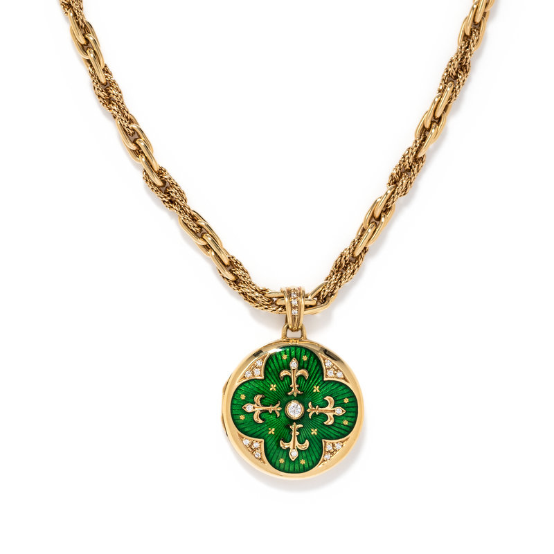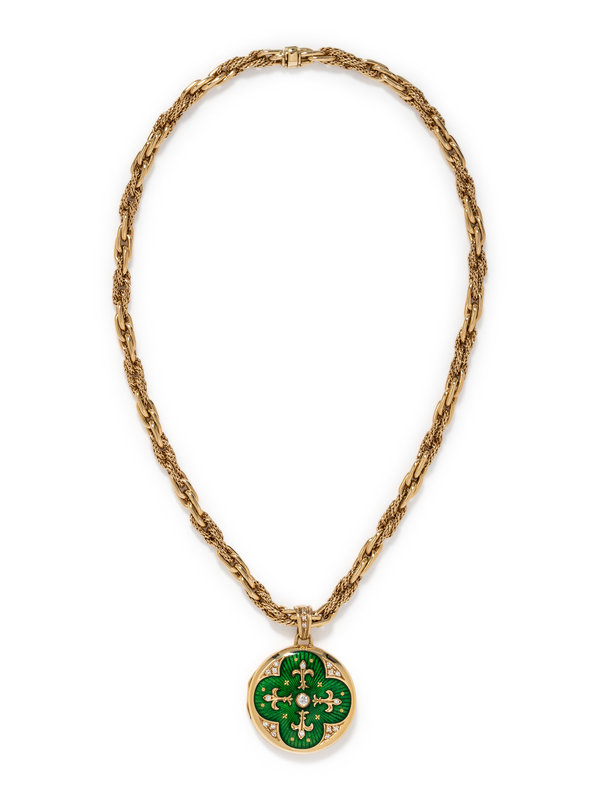 Consisting of a locket pendant with green guilloche enamel and 20 round brilliant cut diamonds weighing approximately 0.27 carat total, suspended from a fancy link chain. 16 inches long.