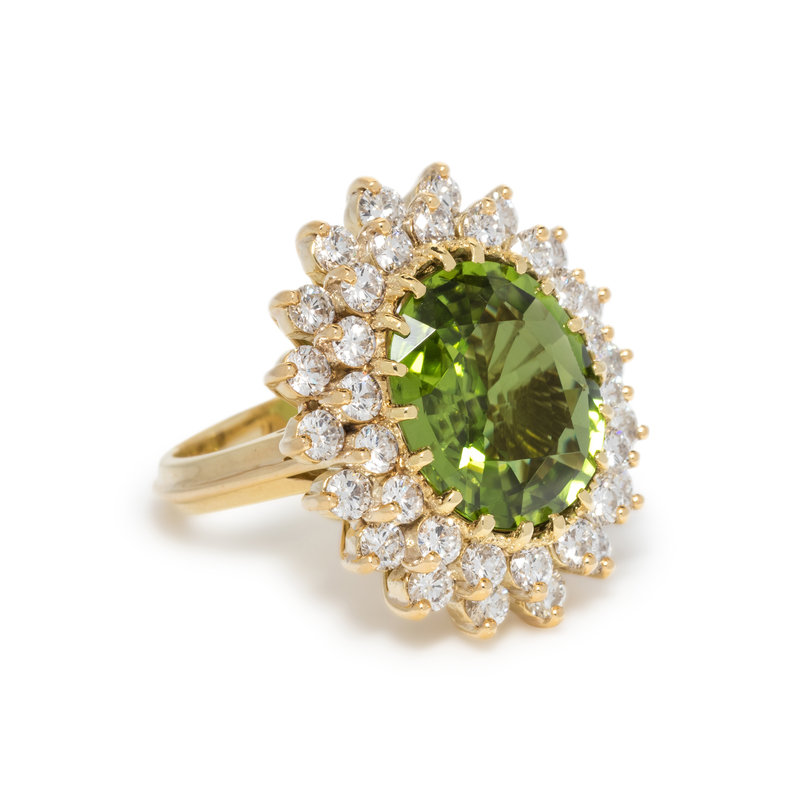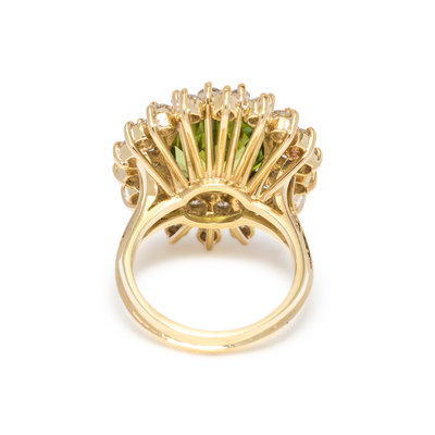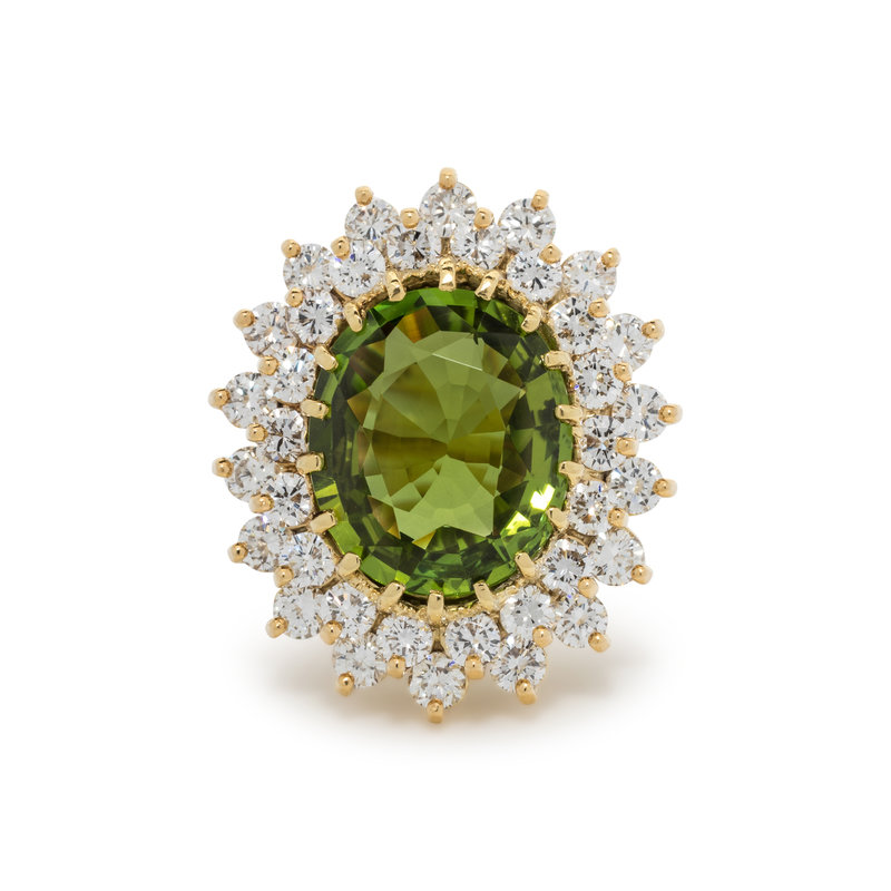 Containing one oval mixed cut peridot measuring approximately 14.30 x 12.15 x 6.20 mm and 36 round brilliant cut diamonds weighing approximately 2.35 carats total. Mounted in yellow gold. Ring size 6 1/4.