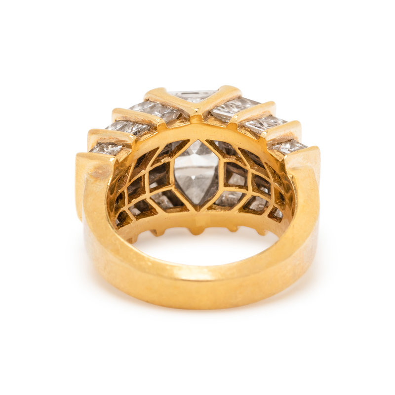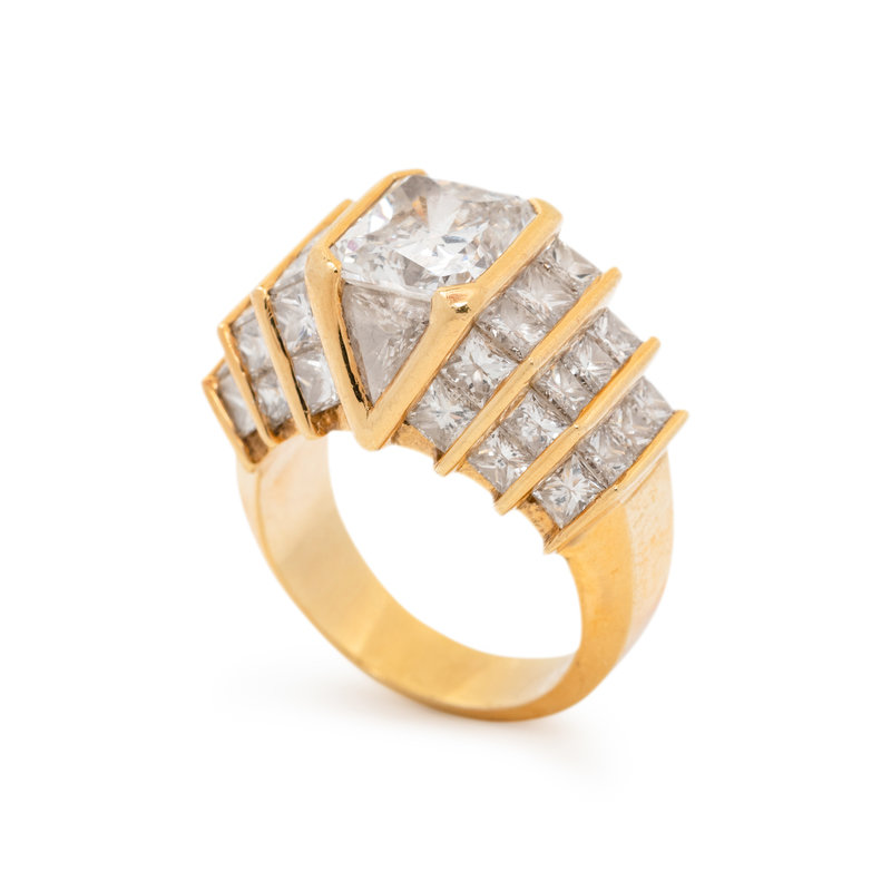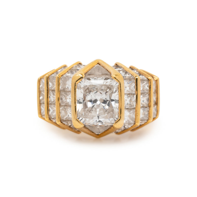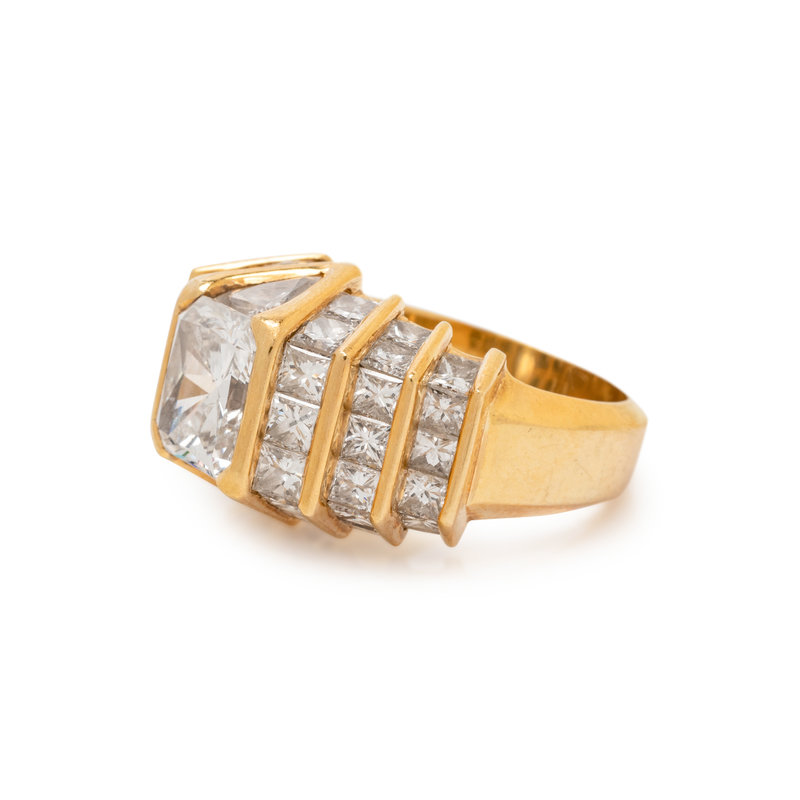 Containing one radiant cut diamond weighing 2.86 carats, two triangular cut diamonds weighing approximately 1.50 carats total and 38 princess cut diamonds weighing approximately 3.90 carats total. Mounted in yellow gold. Ring size 6 1/4.