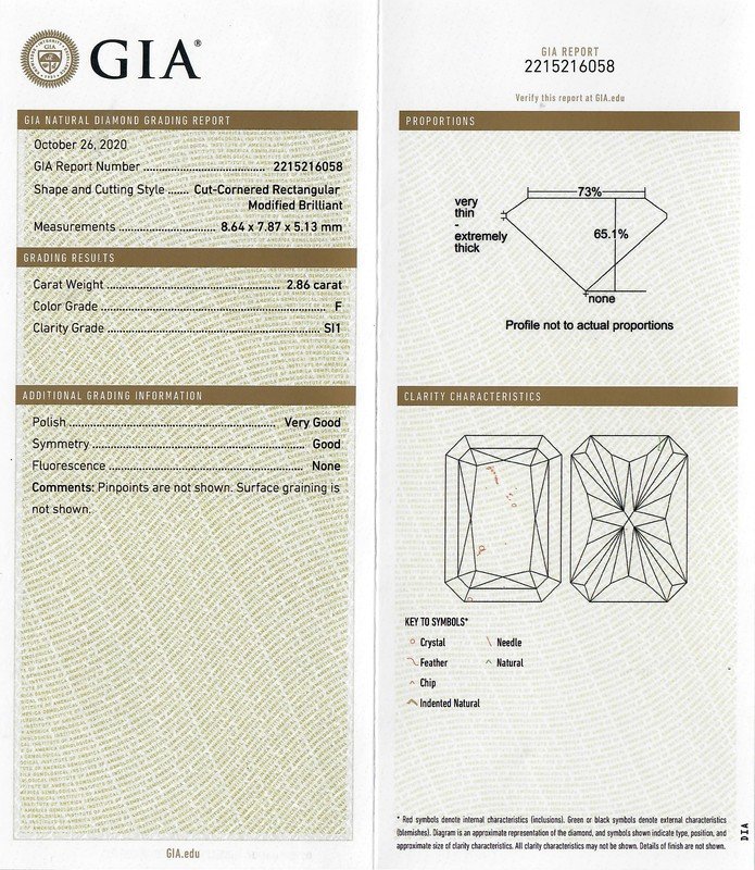 GIA, 2020, Report number 2215216058, 2.86 carats, F color, SI1 clarity, No fluorescence