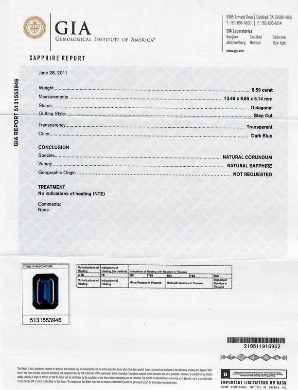 GIA, 2011, Report number 5131553946, Natural Corundum, Sapphire, No indications of heating
