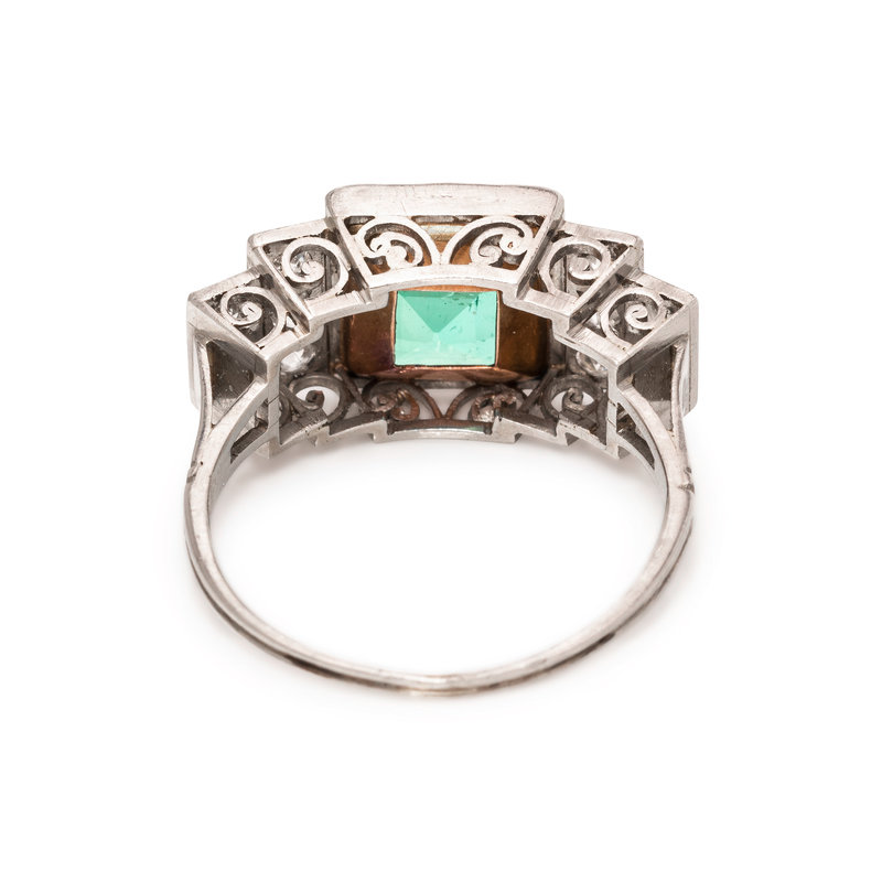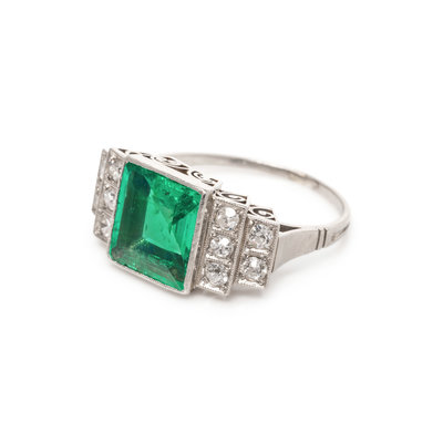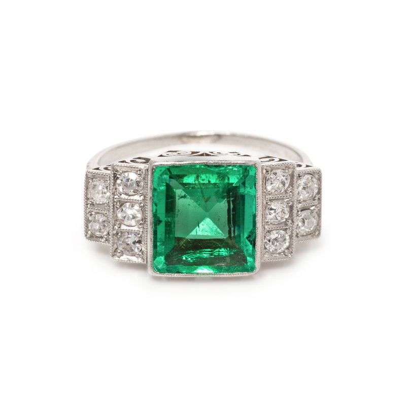 Containing one rectangular step cut emerald measuring approximately 9.50 x 8.40 x 3.75 mm and 10 old mine cut diamonds. Mounted in platinum. Ring size 6.