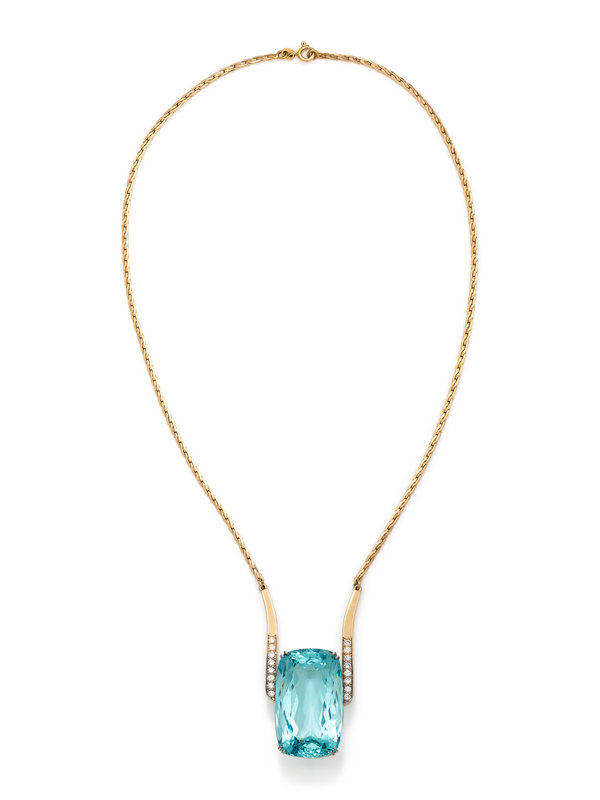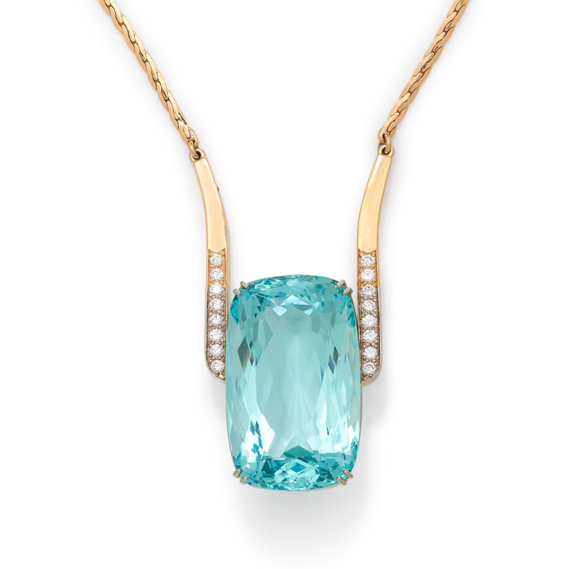 Containing one cushion mixed cut aquamarine measuring approximately 36.00 x 21.85 x 15.15 mm and 16 round brilliant cut diamonds weighing approximately 0.95 carat total. Mounted in bicolor gold. 18 1/2 inches long.