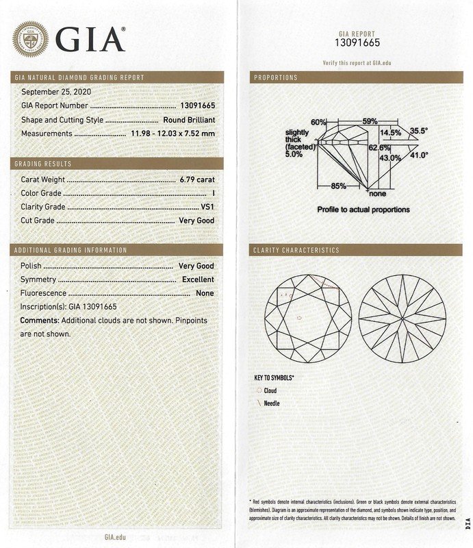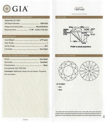 GIA, 2020, Report number 13091665, 6.79 carats, I color, VS1 clarity, No fluorescence