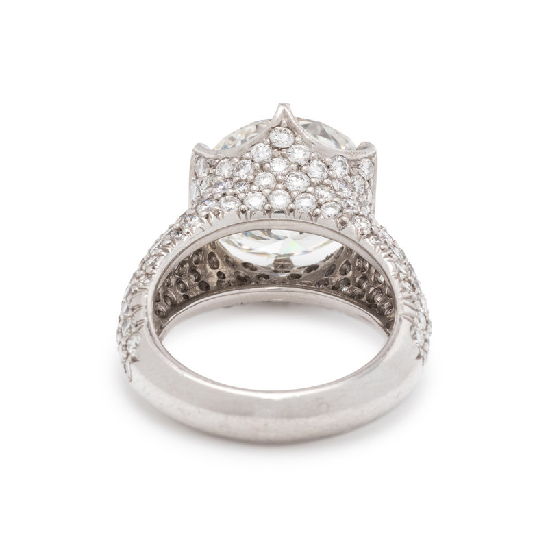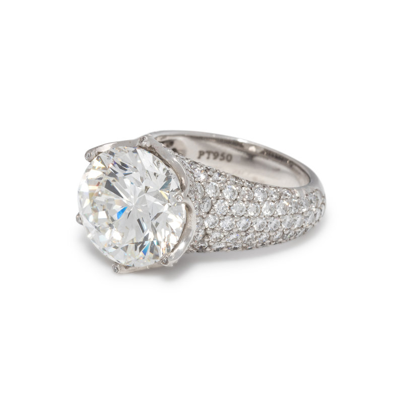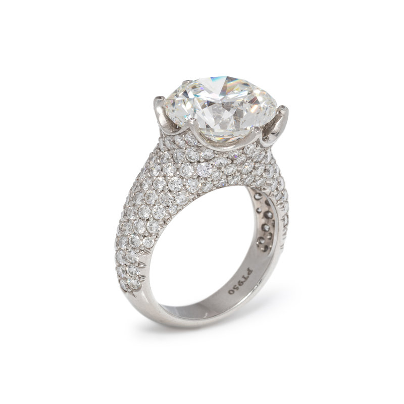 Containing one round brilliant cut diamond weighing 6.79 carats and numerous round brilliant cut diamonds weighing approximately 1.15 carats total with six diamond tipped prongs. Mounted in platinum. Ring size 5 1/4.