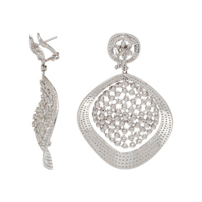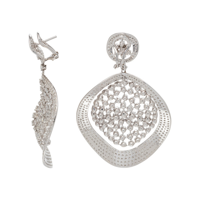 Containing numerous round brilliant cut diamonds weighing approximately 16.00 carats total, posts with clip backs. Mounted in white gold. 2 5/8 inches long.