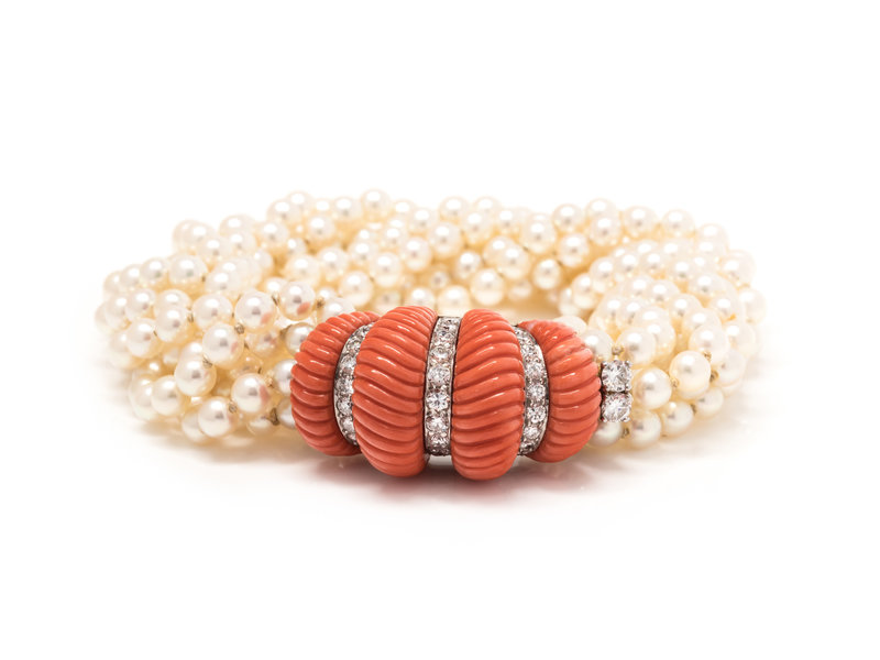 Consisting of eight strands of pearls measuring approximately 4.15-4.30 mm in diameter with a platinum and white gold clasp surmounted with carved coral and 37 round brilliant cut diamonds weighing approximately 1.20 carats total. 7 1/2 inches long.